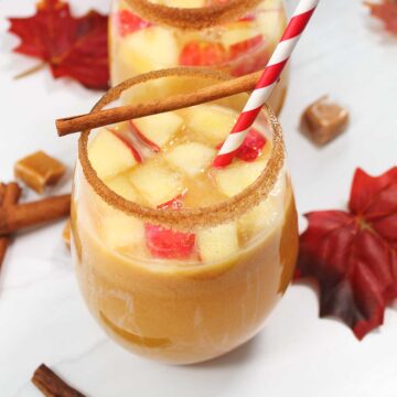 Caramel Apple Sangria tastes like a caramel apple in a glass. A delicious seasonal twist, this sangria combines fresh apple cider, tart crisp apples, vodka, and rich creamy caramel, with the refreshing notes of white wine. Perfect for fall get-togethers or cozy nights by the fire.