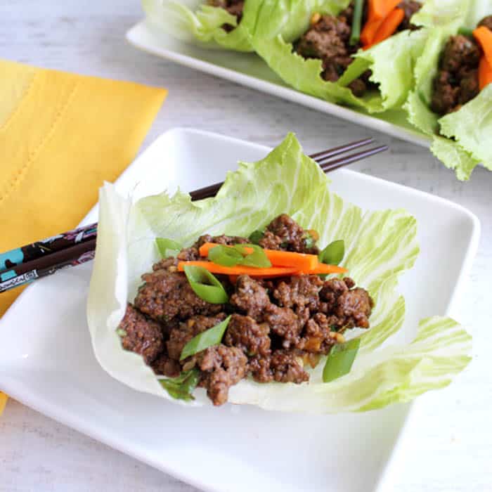 Make a lighter ground beef lunch or dinner with these tasty Asian Beef Lettuce Wraps. Seasoned ground beef is wrapped in lettuce leaves then garnished with green onions, carrots. and peanuts. They're quick & easy and make a tasty low-carb dinner in less than 30 minutes! S