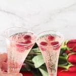 Mix all of the above in a pitcher and divide evenly between two flutes or wine glasses. Add several raspberries to each. Toast and sip!